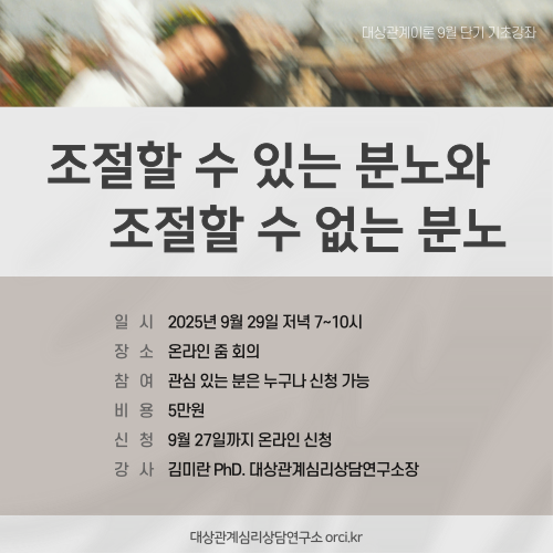 대상관계이론 9월 단기 기초강좌는 [조절할 수 있는 분노와 조절할 수 없는 분노]를 주제로 진행됩니다.