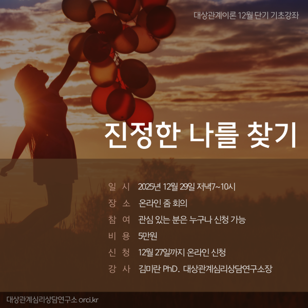 대상관계이론 12월 단기 기초강좌는 [진정한 나를 찾기]를 주제로 진행됩니다.