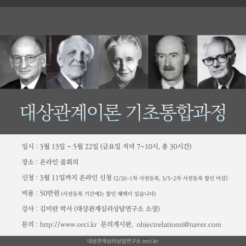 # 본 강좌에 참여시 한국상담학회 연수시간, 대상관계상담심리사 자격을 위한 교육이수시간으로 인정됩니다.