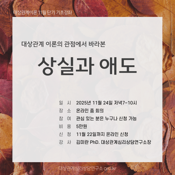 # 월별 기초 단기강좌 주제 : 1월. 마음을 움직이는 내적 대상관계의 토대 2월. 좌절을 성장 동력으로 다루기 3월. 자기(self)의 성장을 가능하게 하는 것 4월. 자폐적 상태가 공생 관계로 발달하는 과정 5월. 심리적 독립을 향한 과정 6월. 내적 심리구조 파악하기 7월. (대상)관계패턴의 이해 8월. 삶의 문제가 반복되는 방식들 9월. 조절할 수 있는 분노와 조절할 수 없는 분노 10월. 죄책감과 우울 다루기 11월. 상실과 애도 12월. 진정한 나를 찾기